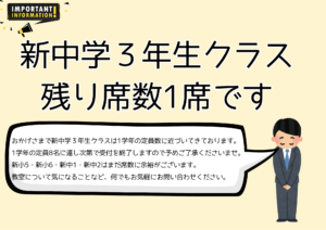 【新中学3年生クラス 残り席数わずかとなりました】