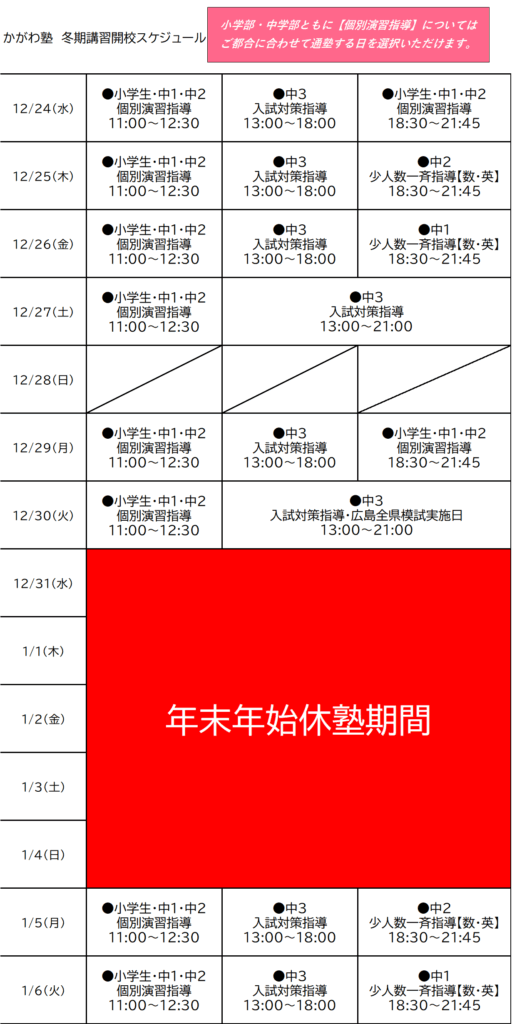12/24(水)~1/6(火)までの期間(12/31(水)~1/4(日)の期間中は年末年始休みです)にて実施予定です。