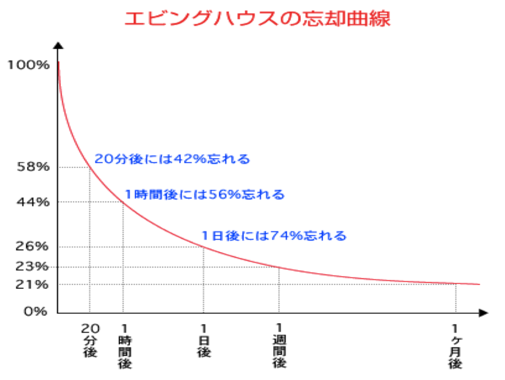 これによると、人はわずか20分でやったことの半分近くを、1週間もたてば7割以上のことを忘れてしまうそうです😨