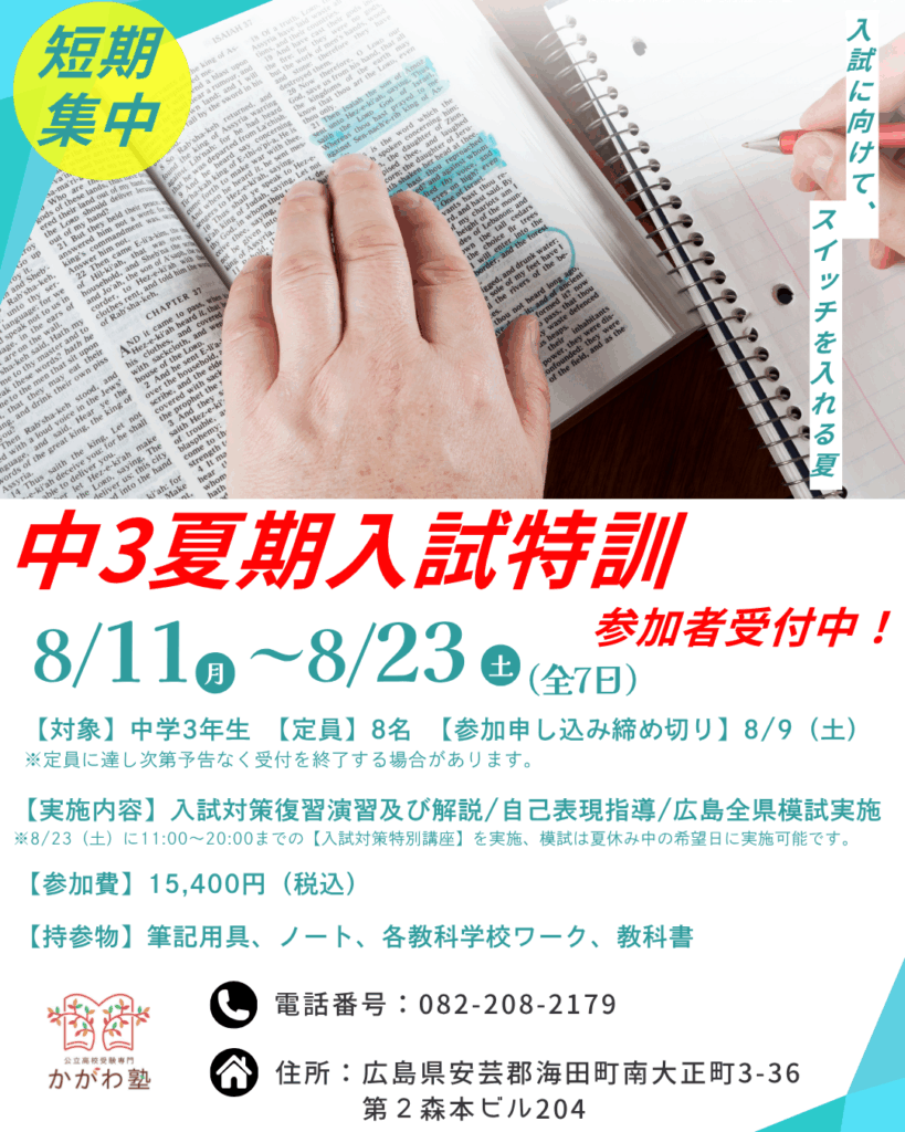 かがわ塾では夏休み途中からでも『入試に向けてそろそろ何かを始めたい!』という受験生のみなさんへ、