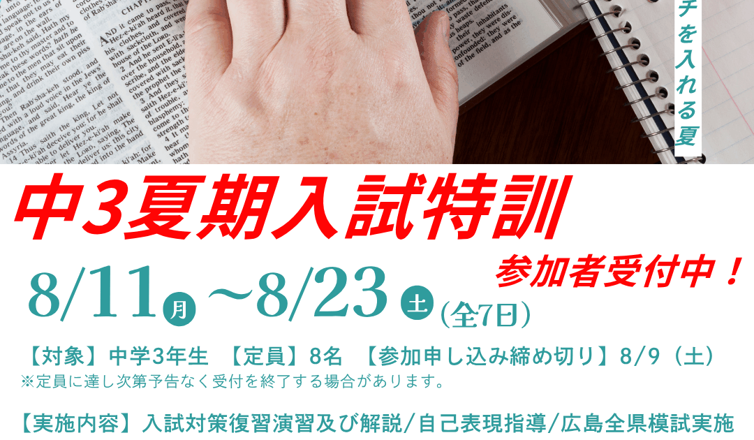 【広島全県模試】夏休み中の希望日に実施(塾の開校時間内にてご家庭のご都合に合わせて模試の実施日を設定いただけます)